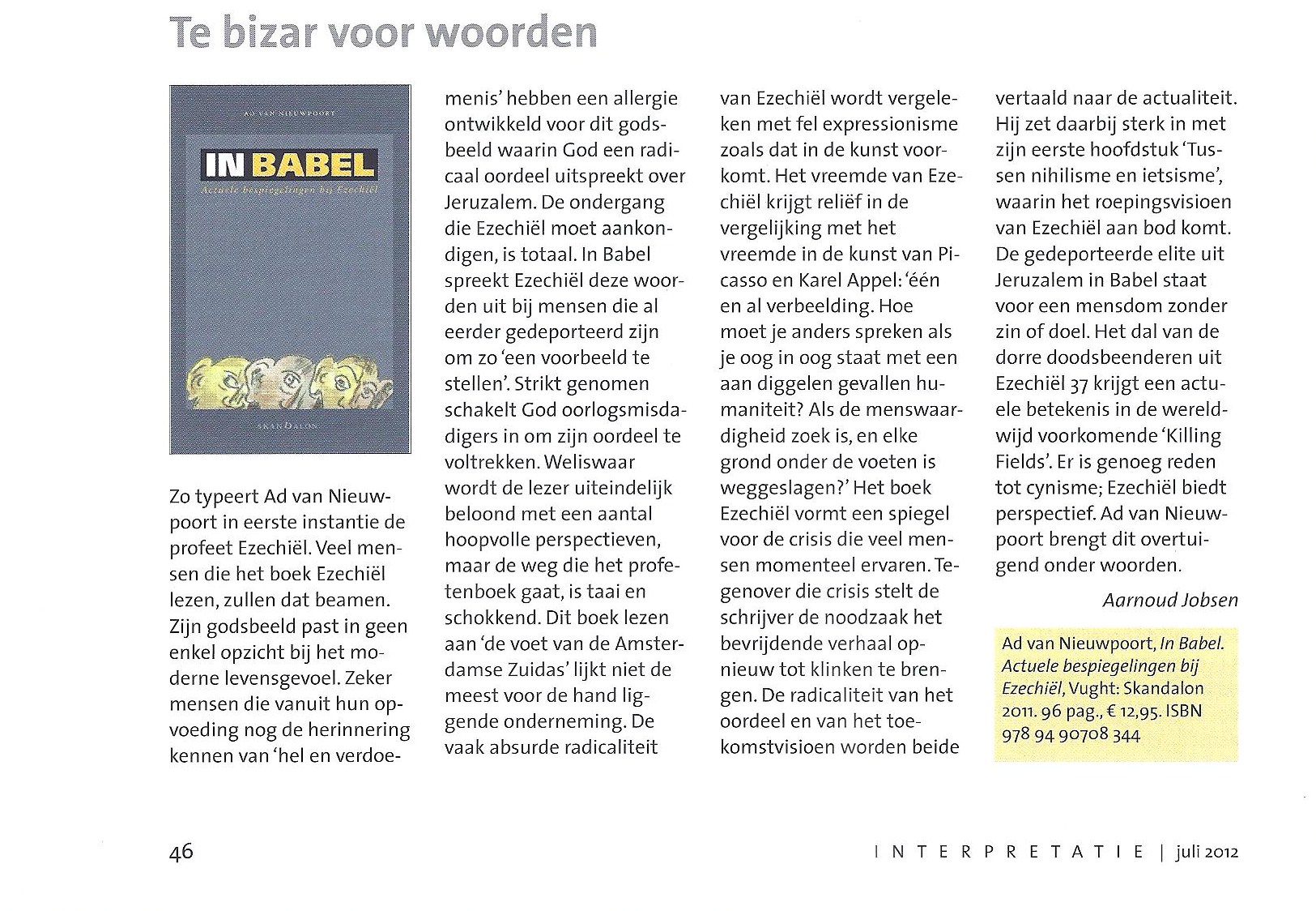 "In de 40 dagentijd van 2012 staat het boek Ezechiël op het leesrooster van veel kerken. ‘In Babel’ biedt voorgangers en gemeenteleden een gids om een weg te vinden door het ingewikkelde landschap van dit gedeelte van de Schrift, richting Pasen. Ad van Nieuwpoort heeft ons een dienst bewezen."