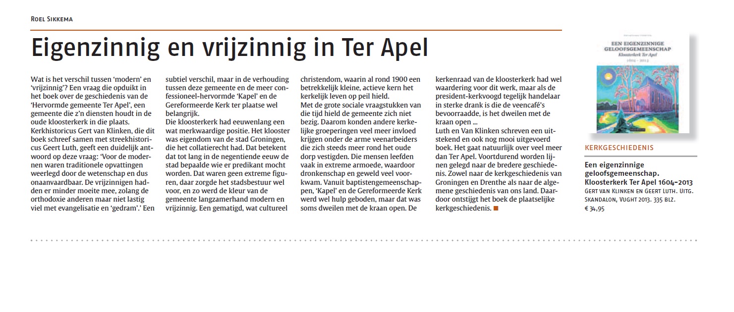 'De auteurs brengen uniek in beeld hoe de vrijzinnigheid wortelschoot en zich ontwikkelde in Ter Apel. Gezien de bovenlokale context mag het boek een standaardwerk heten.'