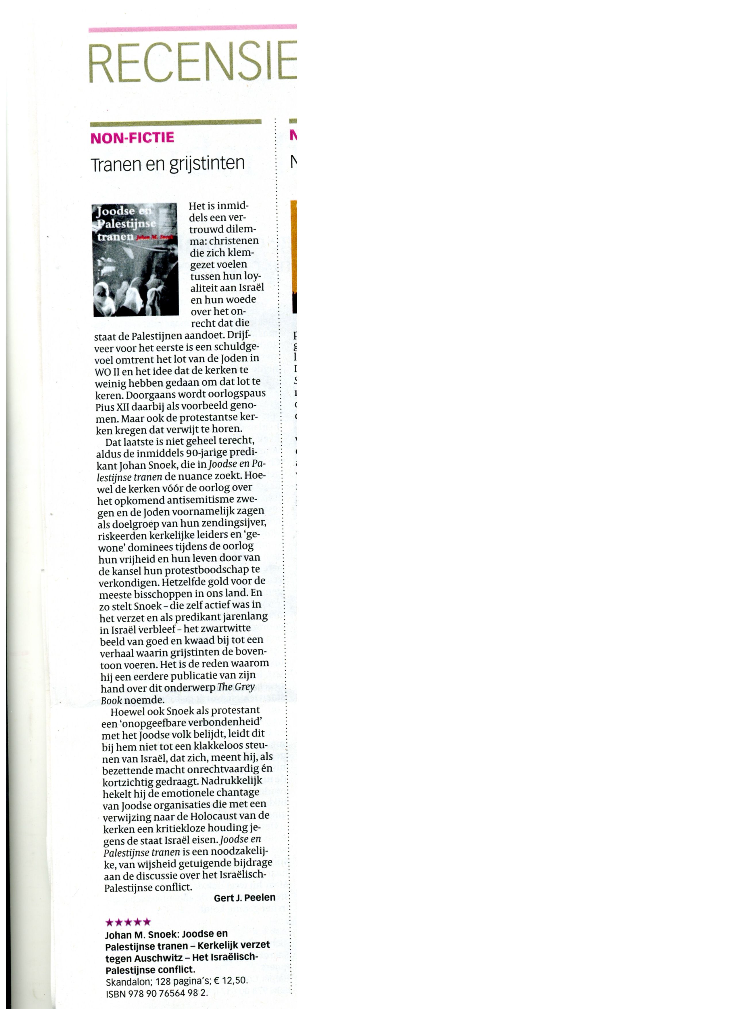 "Dit is een tekst met een heel eigen karakter. Een opmerkelijke mengeling van persoonlijke herinneringen, op degelijk onderzoek gebaseerde beschouwingen over de houding van de kerken tegenover de Jodenvervolging tijdens de Tweede Wereldoorlog, in meer dan één opzicht geëngageerde betogen over de verhouding tussen Israel en de Palestijnen en de kerkelijke positiebepaling op dat gebied. Onverbloemde (morele) oordelen en afstandelijke analytische inzichten wisselen elkaar voortdurend af. Ik ben er zeer door geboeid."