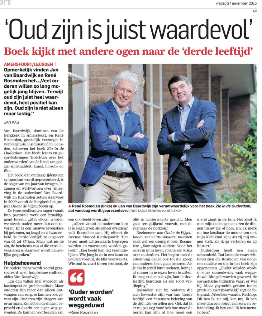 De schrijvers, een predikant en een geestelijk verzorger, verkennen in deze mooi verzorgde en prachtig geïllustreerde uitgave het ouder-zijn vanuit verschillende perspectieven. Niet alleen filosofisch, spiritueel en meditatief, maar ook praktisch en geschreven ‘met de voeten op de grond’. De auteurs weten vanuit hun werk- en levenservaring duidelijk waar het bij dit onderwerp om gaat en doen recht aan de oudere in deze huidige tijd. De zes hoofdstukken bieden steeds een andere blik op het landschap van de ouderdom en geven de lezer alle ruimte om op eigen wijze ermee bezig te zijn. De tekst nodigt uit tot overdenking en uitwisseling, maar kan ook als informatie gelezen worden. De opbouw is overzichtelijk met vragen die kunnen aanzetten tot een gesprek en suggesties voor het opzetten van gesprekskringen. De vele poëtische teksten geven dit boek nog meer diepgang. Al met al zeer inspirerend en werkbaar.