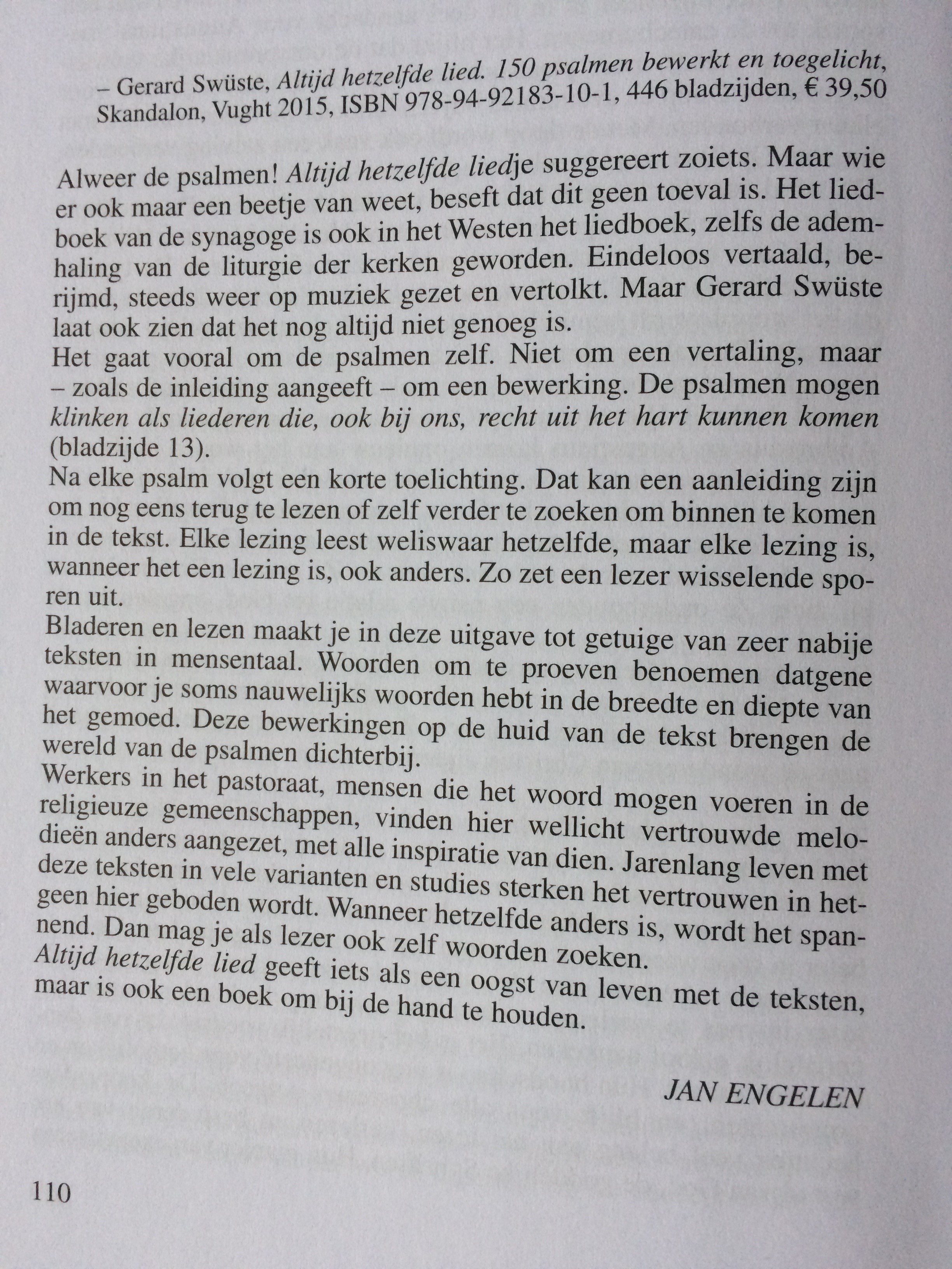 'Ik heb veel waardering voor het boek van Gerard Swüste. Ik sla het nu al enige maanden regelmatig open en ben telkens aangenaam verrast. Hij heeft een goede keuze gedaan met het ‘taalregister’ dat hij consequent doorvoert: hedendaags zonder gewild modern, helder en uitnodigend. De toelichtingen bij iedere psalm tonen dat hij de tekst heel scherp bekeken heeft, en zich ook weet te beperken, want het is verleidelijk er van alles bij te halen. Ter vergelijking: achter het werk van andere hedendaagse vertalers zie je heel dikwijls hun persoon oprijzen, bij Gerard Swüste daarentegen de mogelijke, onbekende psalmist. Gerard blijft een vertolker.